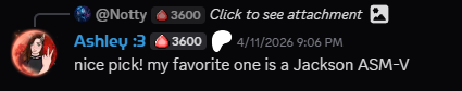 | current | 01:24, 18 April 2026 | 425 × 84 (22 KB) | Ashley (talk | contribs) | Ashley replying to Notty about her guitar. |