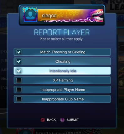 Calkvin reporting a bad actor in the game Rocket League.