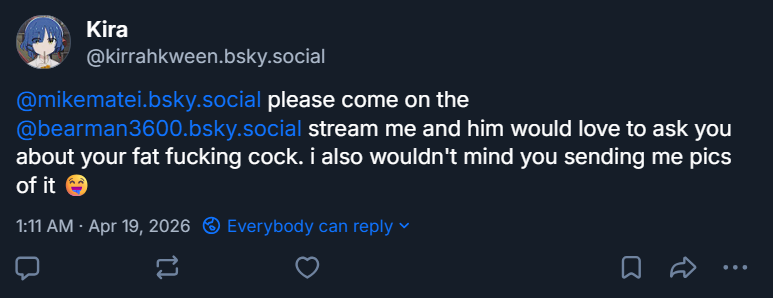 stream me and him would love to ask you about your fat fucking cock. i also wouldn't mind you sending me pics of it 🤤